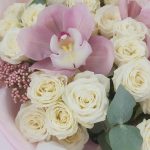 Роза кустовая Эквадор – 9 шт.Орхидея цимбидиум бутон – 3 шт.Озотамнус розовый – 5 шт.Эвкалипт – 3 шт.Пистация – 5 шт.Упаковка дизайнерская – 1 шт.