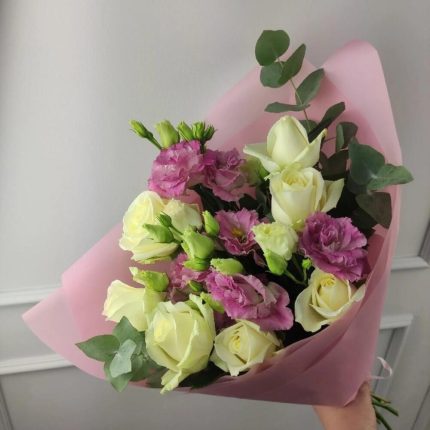 Букет с розами и лизиантусами
