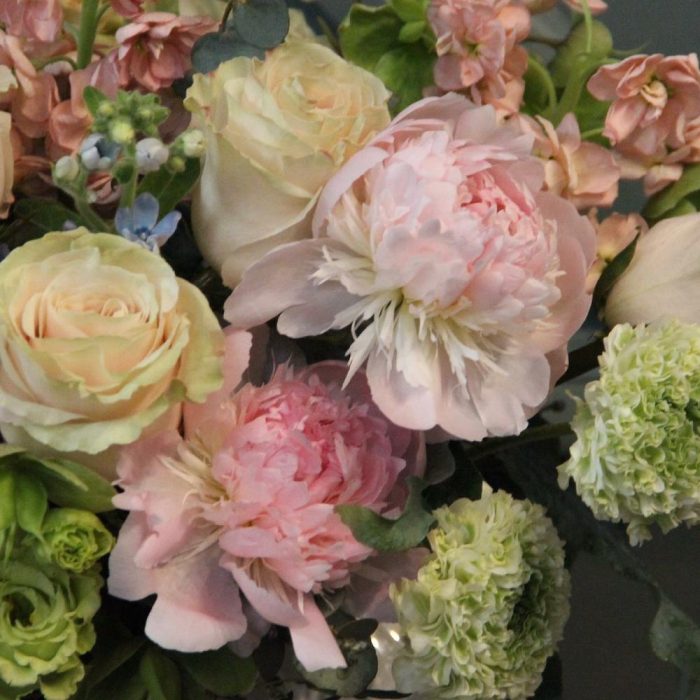 Пион – 9 шт.Твидия – 6 шт.Лизиантус – 3 шт.Маттиола – 3 шт.Роза – 7 шт.Эвкалипт – 4 шт.флебодиум – 3 шт.Ваза керамика – 1 шт.Оазис флористический – 1 шт.
