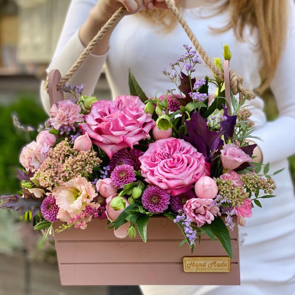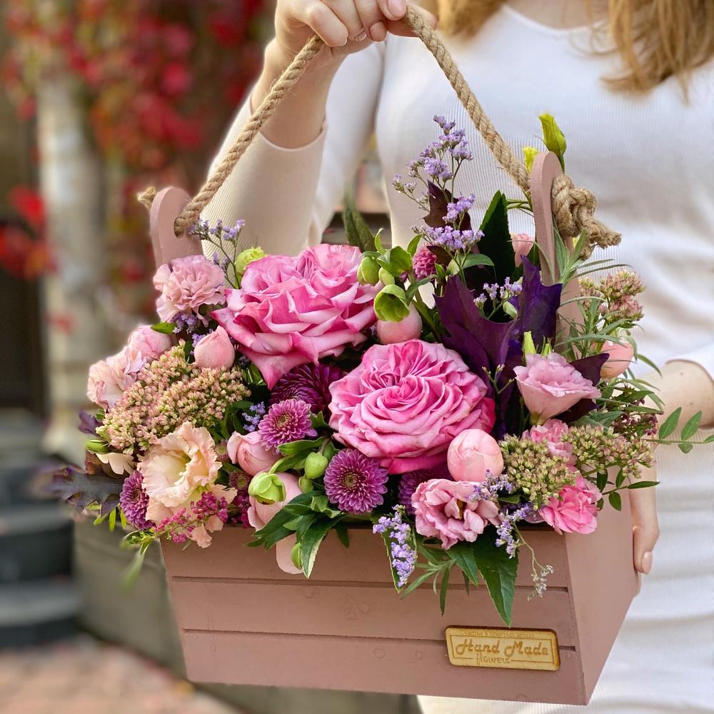 Роза пионовидная – 2 шт.Роза кустовая – 2 шт.Седум – 2 шт.Сантини – 3 шт.Лимониум – 1 шт.Диантус – 3 шт.Лизиантус – 1 шт.Листья Дуба – 1 шт.декоративная зелень – 3 шт.цветы микс – 3 шт.Ящик деревянный – 1 шт.Флористическая губка – 1 шт.