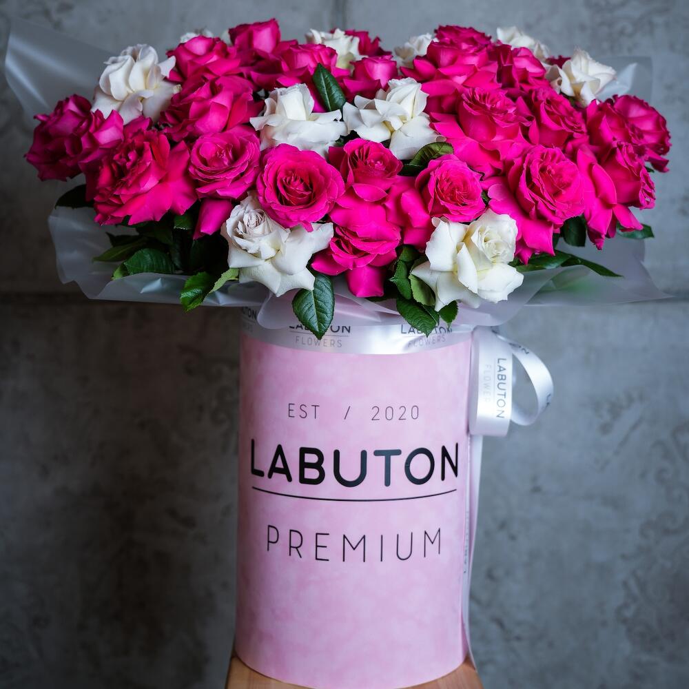 роза с французским раскрытием – 35 шт. Коробка – 1 шт. Оазис флористический – 3 шт.