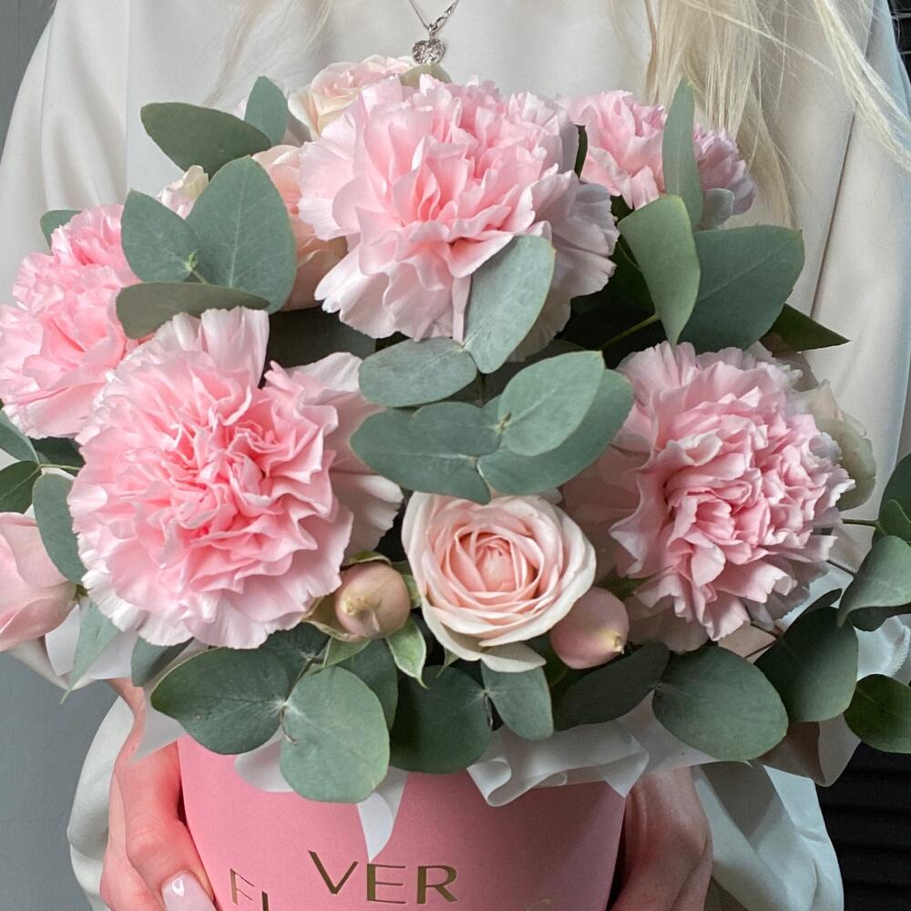 Диантусы с кустовыми розами в коробке