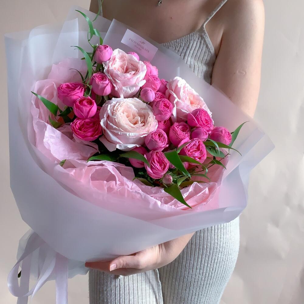 Кустовая пионовидная роза – 5 шт.тсумуги роза – 3 шт.Эвкалипт – 2 шт.Упаковка дизайнерская – 1 шт.Кризал (подкормка) – 1 шт.
