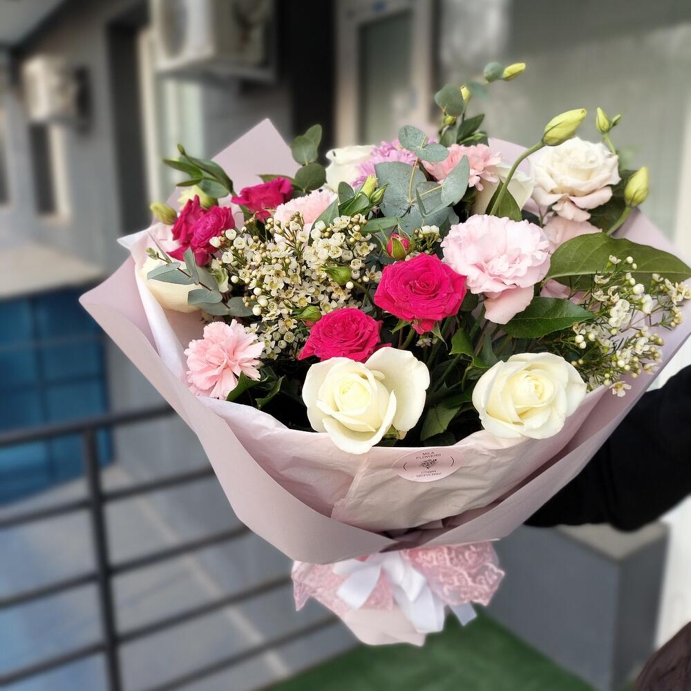 Альстромерии, Гвоздики, Кустовые розы, Лизиантусы, Розы, Хризантемы