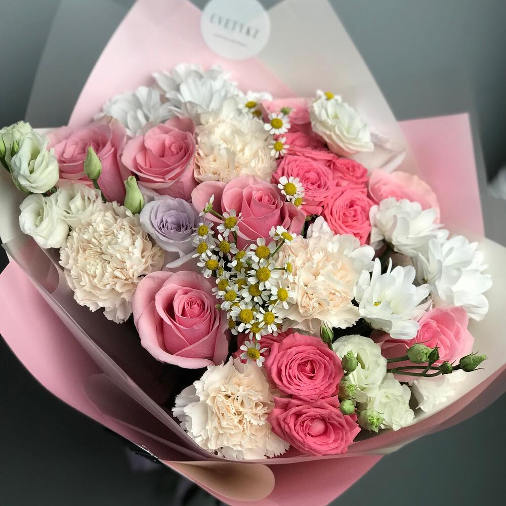 Гвоздики, Лизиантусы, Розы, Тюльпаны