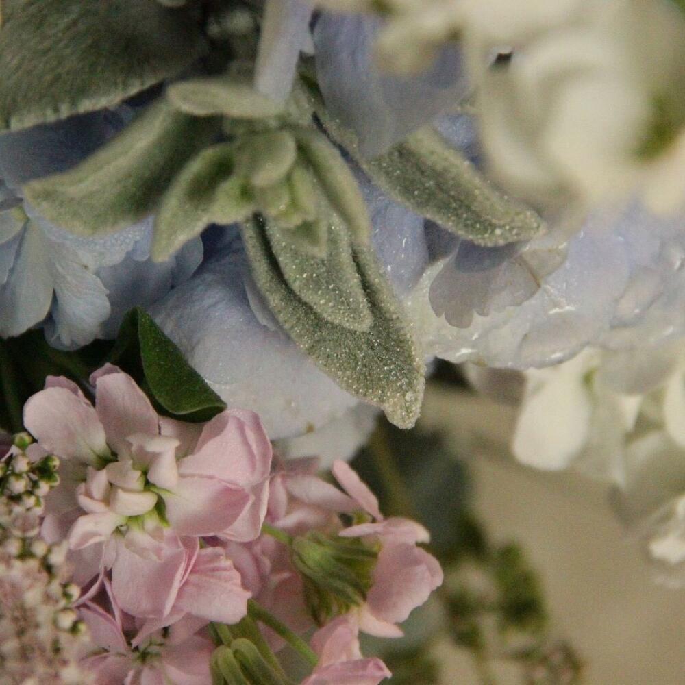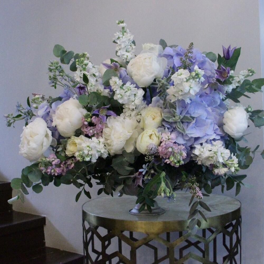 Гортензия – 4 шт.Пион – 7 шт.Роза пионовидная – 9 шт.Маттиола – 15 шт.Клематис – 5 шт.Твидия – 5 шт.Стахис – 5 шт.Травы – 5 шт.Эвкалипт – 15 шт.Кашпо – 1 шт.