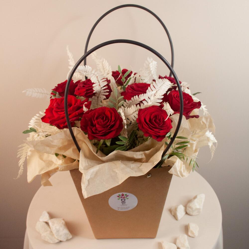 Роза красная – 9 шт. Зелень – 1 шт. Сумка – 1 шт.
