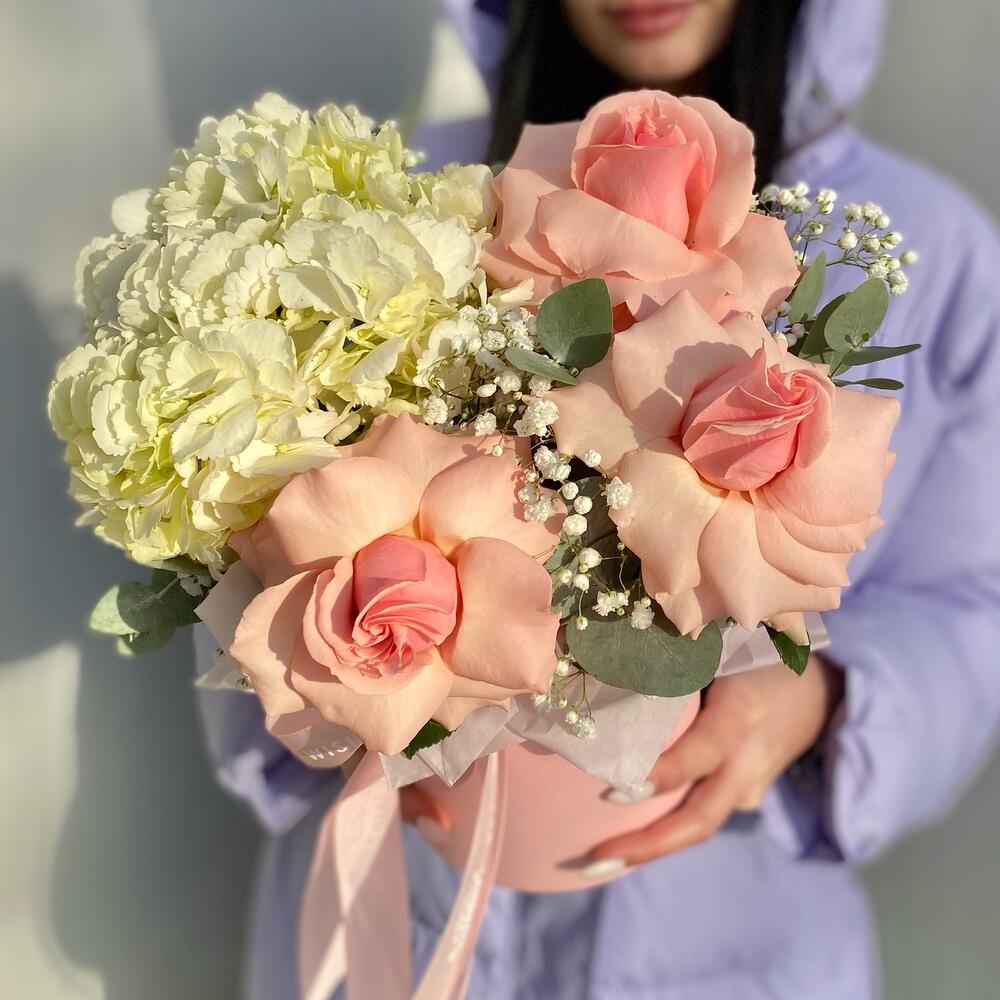 Гипсофила – 2 шт.Гортензия – 1 шт.Тишью – 1 шт.Коробка шляпная – 1 шт.Оазис флористический – 1 шт.Роза pink mondial – 3 шт.