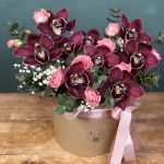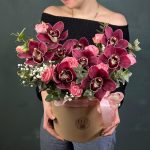 Гипсофила – 1 шт.Орхидея Цимбидиум – 9 шт.Эвкалипт – 4 шт.Лента атласная – 2 шт.Коробка шляпная – 1 шт.Роза кустовая пионовидная – 2 шт.