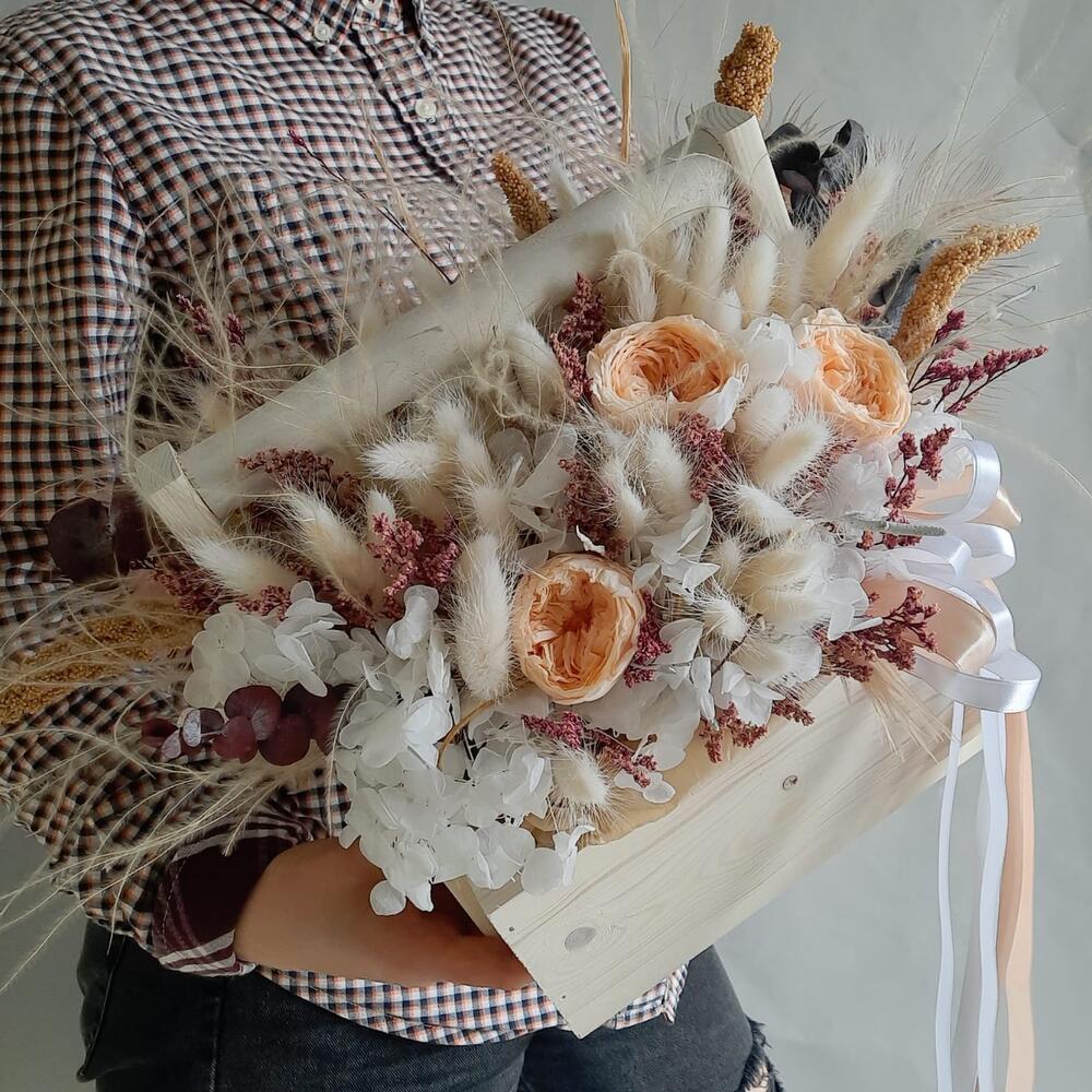 Лента атласная – 3 шт.Ящик деревянный – 1 шт.Оазис для сухоцветов – 1 шт.Эвкалипт стабилизированный – 4 шт.камыш декоративный – 4 шт.гортензия стабилизированная – 1 шт.ковыль связка – 4 шт.лагурус (сухоцвет) пучок – 3 шт.ветки декоративные – 10 шт.роза пионовидная стабилизированная – 3 шт.лимониум стабилизированный – 3 шт.
