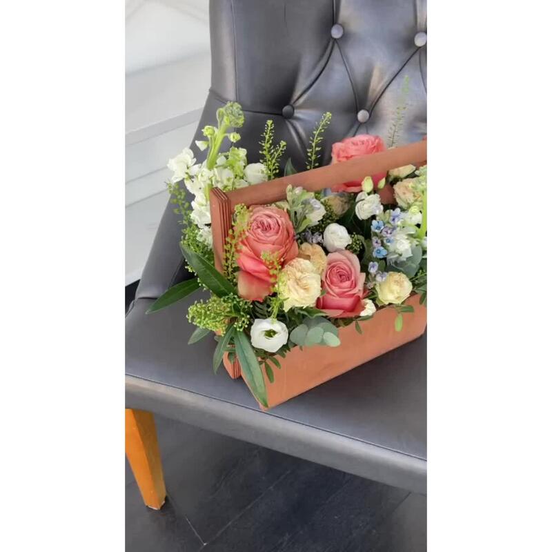 Лизиантус – 4 шт.Маттиола – 2 шт.Эвкалипт – 2 шт.Роза кустовая пионовидная – 3 шт.Скиммия – 3 шт.Гринбелл – 2 шт.Роза садовая – 3 шт.Оксипеталум – 4 шт.Ящик деревянный – 1 шт.Оазис флористический – 1 шт.