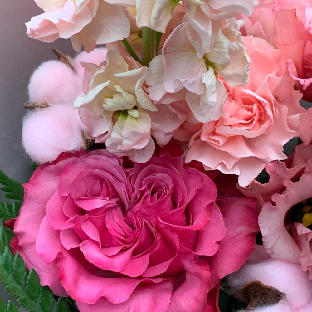 кантри блю пионовидная роза – 2 шт.маттиола априкот махровая – 2 шт.Лизиантус – 1 шт.Хлопок (сухоцвет) – 2 шт.Папоротник – 2 шт.
