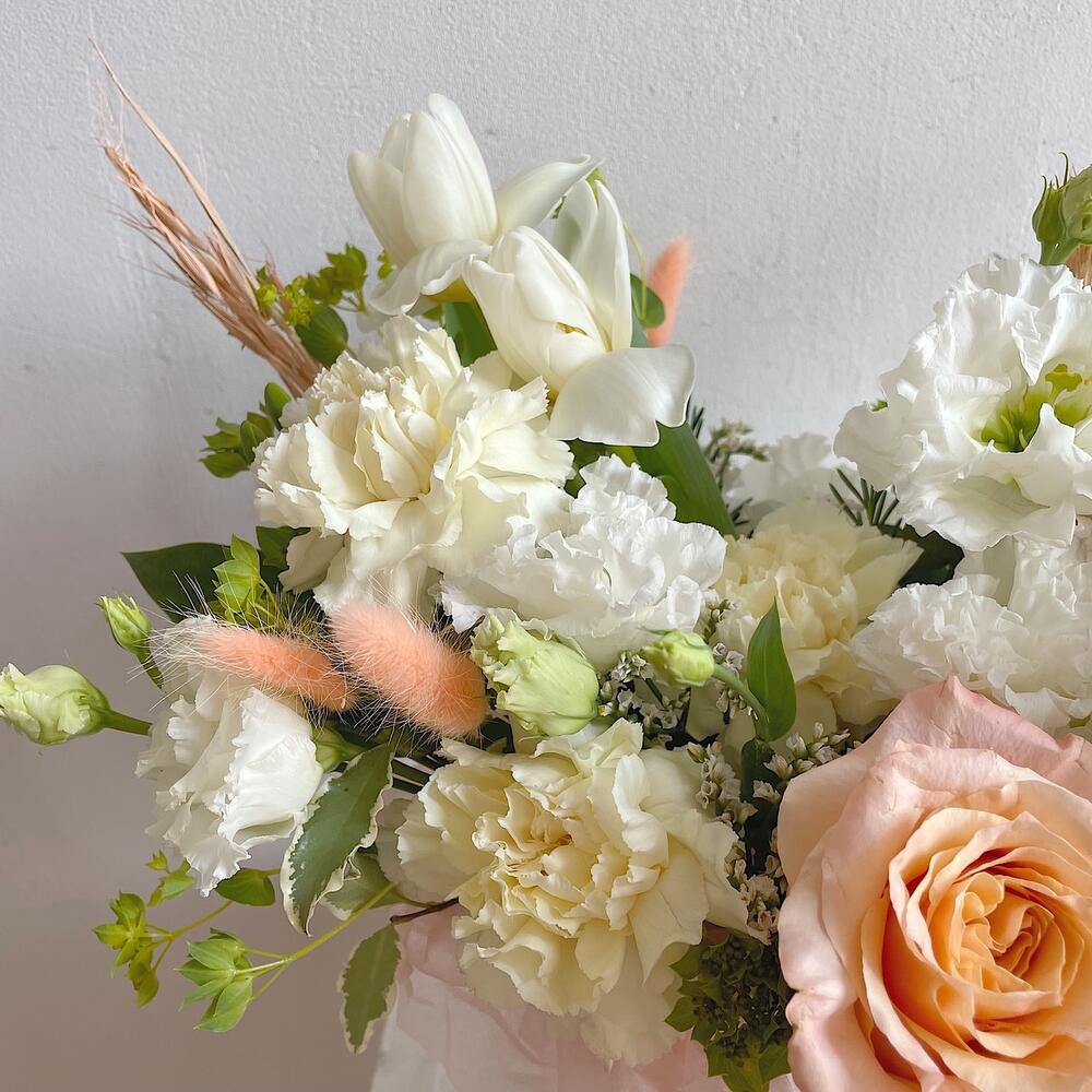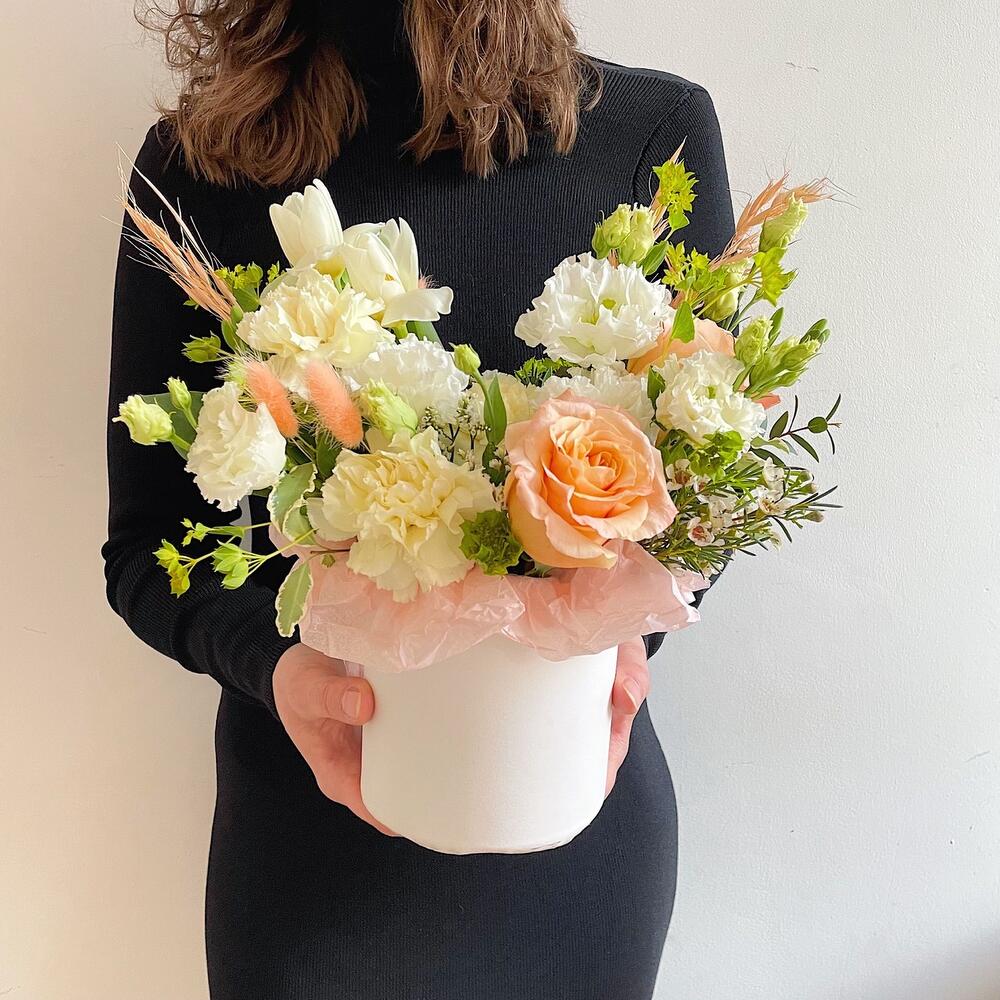 Роза персиковая – 2 шт.Тюльпан – 2 шт.Лизиантус – 1 шт.Диантус – 1 шт.Хамелациум – 1 шт.Буплерум – 1 шт.Питтоспорум – 1 шт.овес сухоцвет – 3 шт.Лагурус – 3 шт.Коробка шляпная – 1 шт.Губка флористическая – 1 шт.