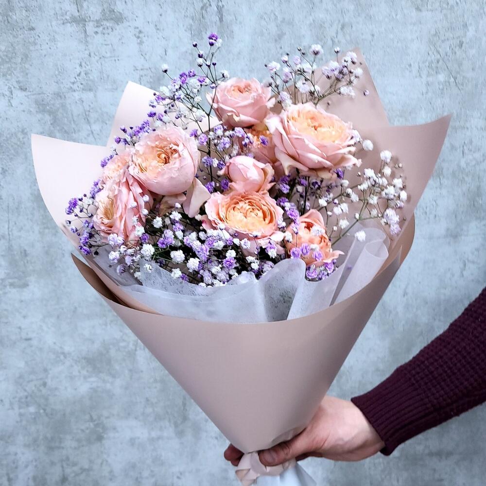 Гипсофила – 1 шт.Роза кустовая пионовидная – 2 шт.Упаковка дизайнерская – 1 шт.