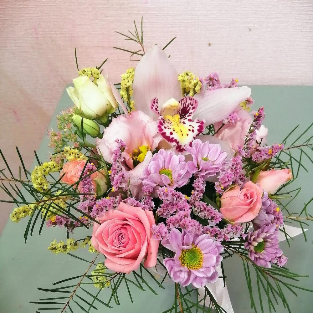 Роза кустовая – 1 шт.Лента атласная – 1 шт.Сантини – 1 шт.Орхидея цветок – 1 шт.Оазис флористический – 1 шт.зелень декоративная – 1 шт.Стакан декоративный – 1 шт.