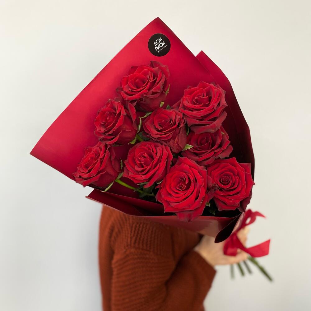 Лента атласная – 1 шт.Упаковка дизайнерская – 1 шт.роза explorer эквадор – 9 шт.