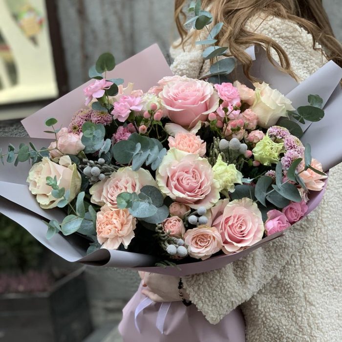 Пастельно-розовая гамма с пионовидной розой, ароматным эвкалиптом, сортовым диантусом, серебристая бруния и махровый лизиантус.