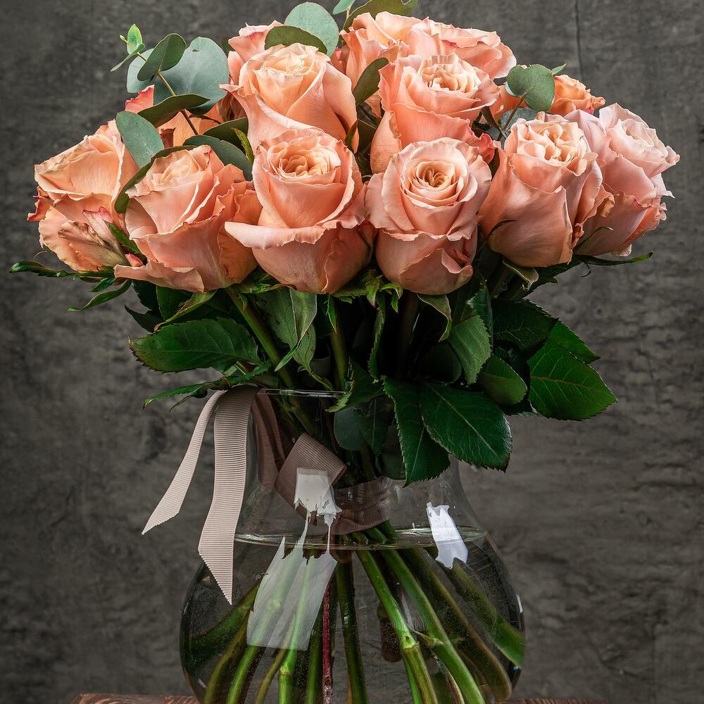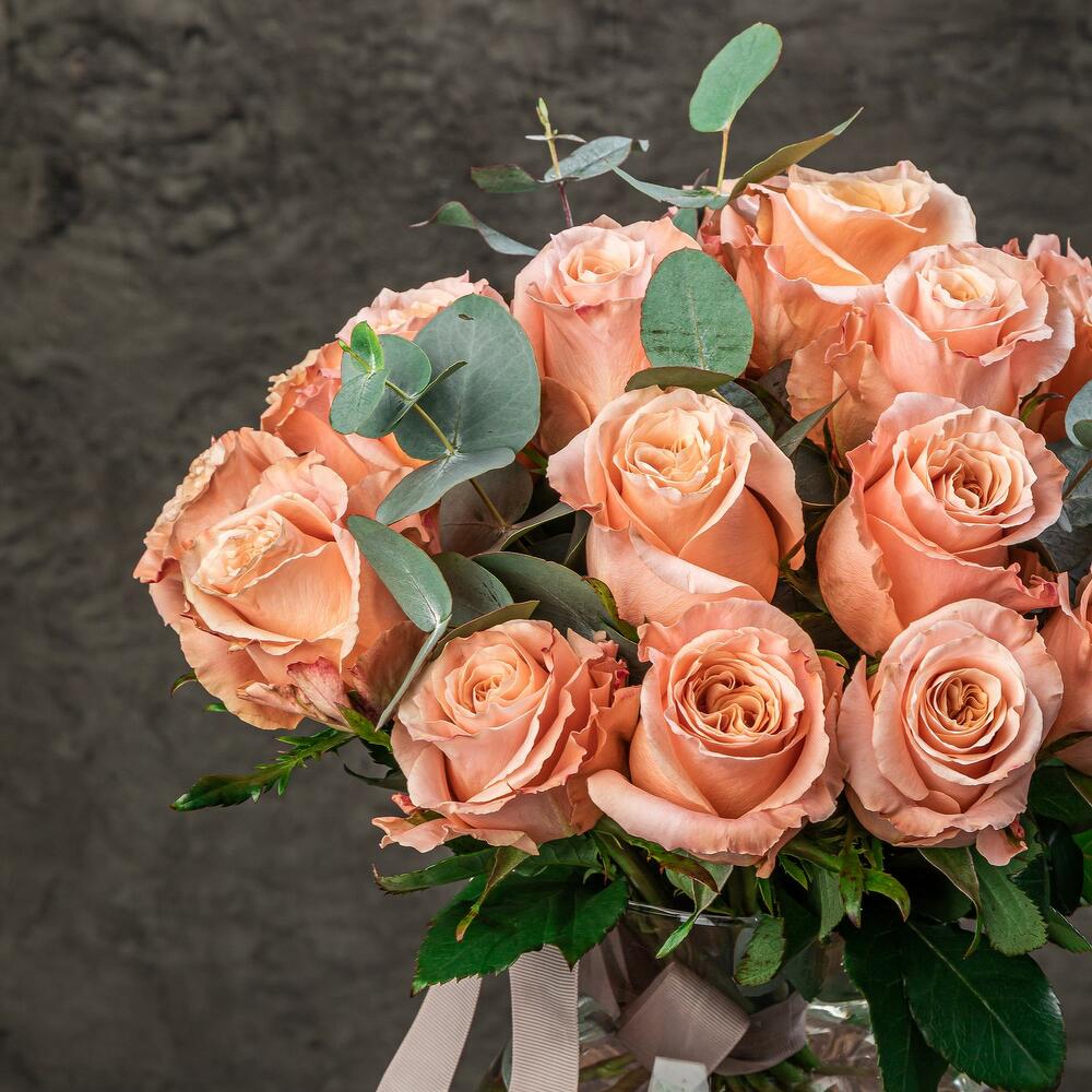 Оригинальная и удобная подача классического и элегантного монобукета из роз с ароматным эвкалиптом. Стойкий сорт розы, необычный персиковой-коралловый оттенок и свежий аромат эвкалипта создадут незабываемую атмосферу в любом месте: дом, офис, ресторан. Элегантная ваза-букетница … Показать ещёподойдет под любой букет или набор цветов в будущем.