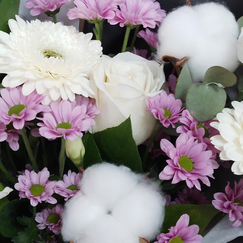 Хлопок натуральный – 2 шт.Роза Эквадор – 1 шт.Хризантема Сантини – 3 шт.эустома белая – 1 шт.Гвоздика – 2 шт.Эвкалипт – 1 шт.Рускус Израиль – 2 шт.Упаковка дизайнерская – 1 шт.Лента атласная – 1 шт.