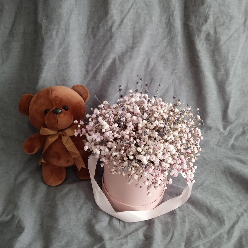 Гипсофила розовая с лавандой в шляпной коробке