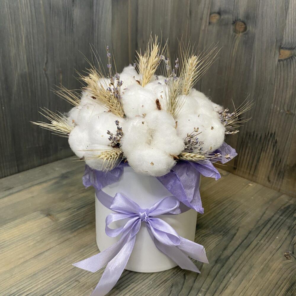 Коробка шляпная – 1 шт.Тишью – 1 шт.Лента атласная – 2 шт.Хлопок натуральный – 10 шт.Рожь – 14 шт.Лаванда пучок – 1 шт.