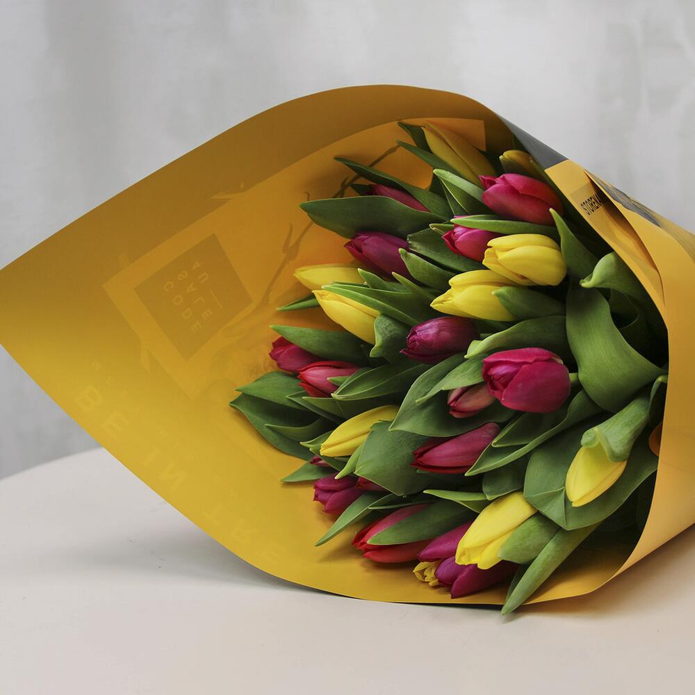 тюльпаны стандартные – 25 шт.Пленка – 1 шт.Лента – 1 шт.