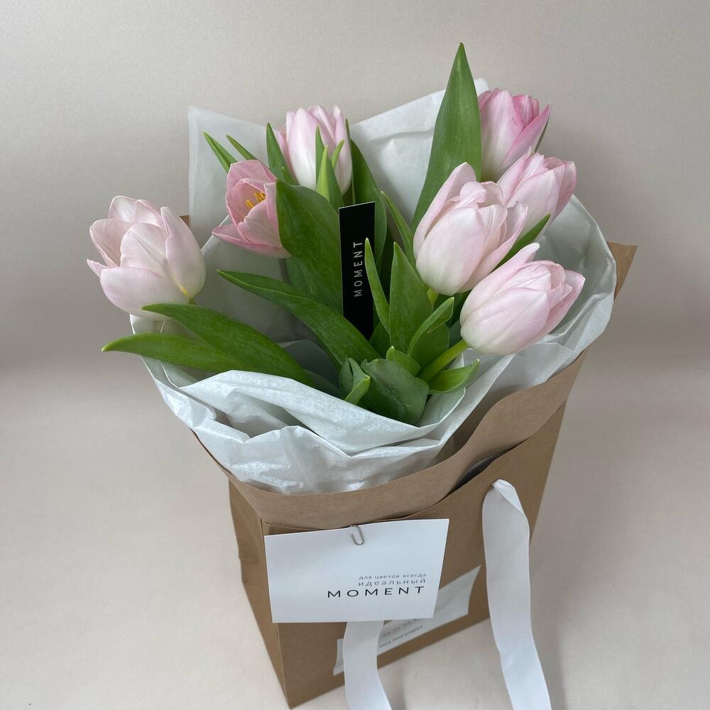 Тюльпан – 7 шт.Тишью – 2 шт.Крафт – 2 шт.крафтовый пакет – 1 шт.Карточка для подписи – 1 шт.