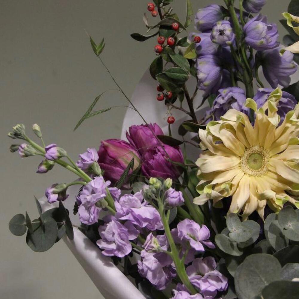 Дельфиниум – 2 шт.Тюльпан сортовой – 3 шт.Гербера – 3 шт.Ранункулюс – 1 шт.Маттиола – 4 шт.кизильник – 2 шт.кукушкины слезы – 2 шт.Эвкалипт – 5 шт.Упаковка – 1 шт.